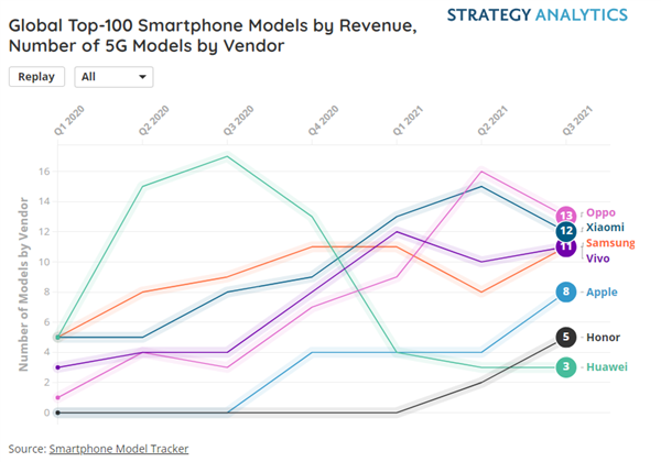 有趣的是,按照机型销售收入来看,在全球TOP100 5G手机中,OPPO有13款入选,是数量最多的企业,其次是小米的12款,三星/vivo都是11款,苹果是8款(iPhone 12/13全系)、荣耀5款、华为3款。