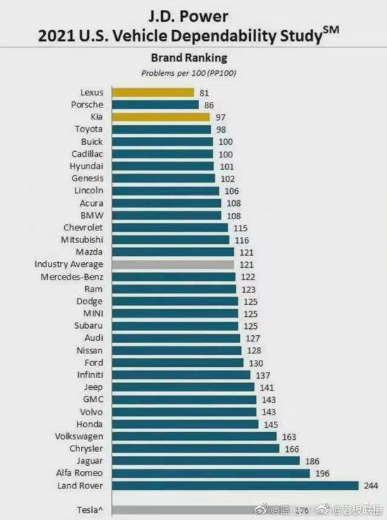 日前美国权威机构《消费者报告》推出了2021年汽车可靠性调查报告,特斯拉的成绩和去年一样,可靠性倒数第二,仅高于林肯汽车。J.D。Power的数据也显示,特斯拉汽车的故障率非常高。