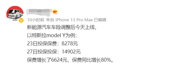然而,有网友曝光,同是特斯拉Model Y,23日投保的费用为8278元,而27日新政之后,投保费用暴涨到1.4万多元,涨幅高达80%。