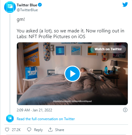 新浪科技讯 北京时间1月21日早间消息,据报道,Twitter用户现在可将NFT作为其账户的个人头像了,这是为了让更多用户展示数字艺术并鼓励人们注册其订阅产品Twitter Blue。