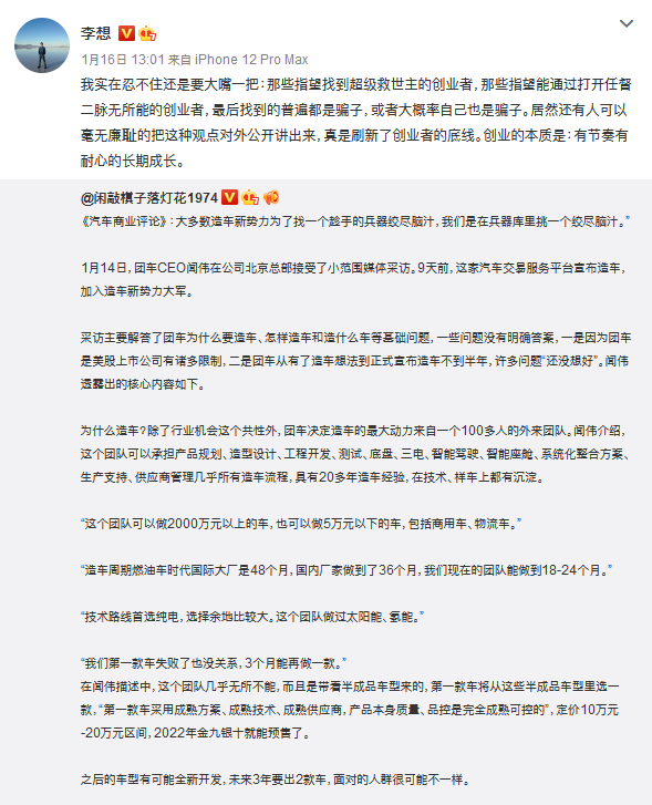 前段时间,理想汽车CEO李想,日前在微博转发一篇团车CEO闻伟宣布造车后接受媒体采访的内容,炮轰其刷新了创业者的底线。