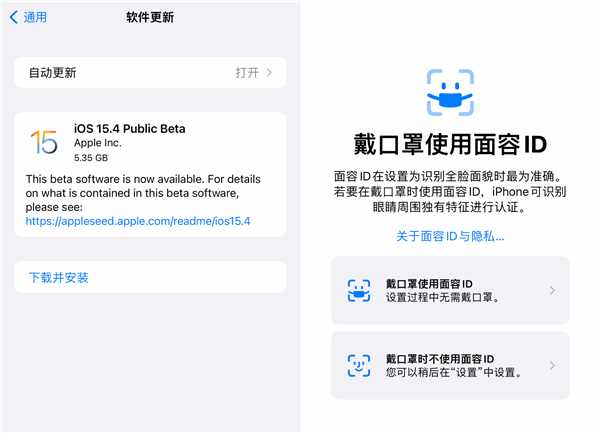 iOS 15.4 Beta系统的大小约为5.35GB,完成更新需要十几分钟的等待。之后重启进入系统,你就可以体验到最新的口罩面容解锁功能。和以往的面容ID不同,口罩面容解锁会要求你输入佩戴眼镜和摘下眼镜两种状态下的数据,从而保证识别成功率。