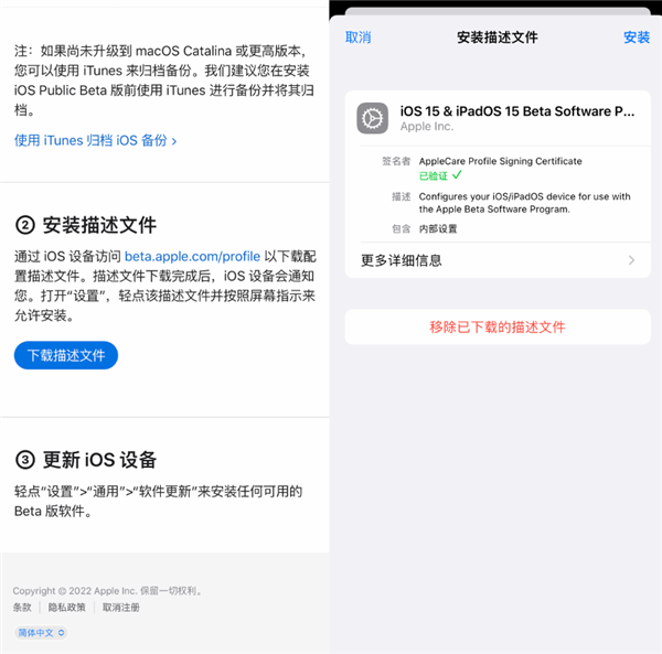 完成注册并加入后,你就可以在网页找到下载描述文件的选项,点击下载并在设置中完成描述文件的安装,在过程中需要你输入密码,并且同意一段很长的声明,之后,你就已经可以收到最新的Beta测试系统的推送。