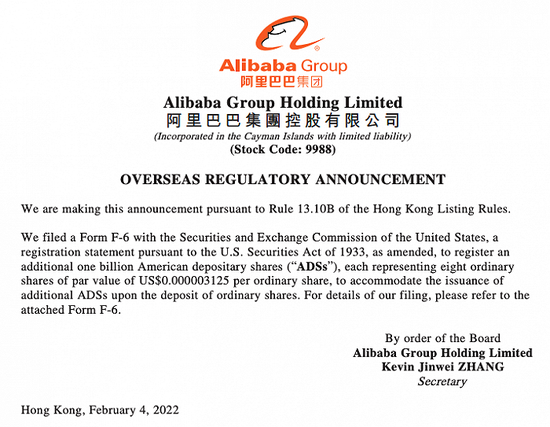 阿里巴巴2月4日晚间在港交所公告,已向美国证券交易委员会(SEC)提交F-6文件,申请额外注册10亿份ADS(美国存托股份),每份存托股份代表8股普通股,每股面值0.000003125美元。