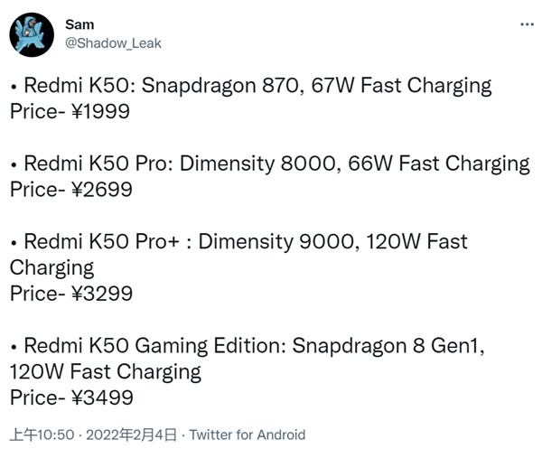 从这位曝料者发布的信息来看,红米K50,搭载骁龙870处理器,支持67W快充,售价1999元人民币起。