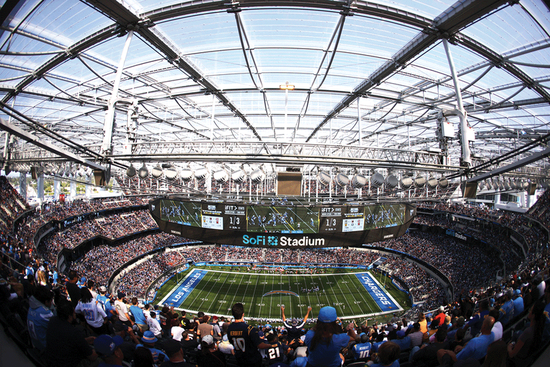 SoFi体育场的天蓬屋顶采用乙烯四氟乙烯材料(ETFE),这是一种透明轻巧的塑料材料,让阳光可以在场内散射。体育场侧面还设有开窗,让几英里外的太平洋海风能够吹进来。