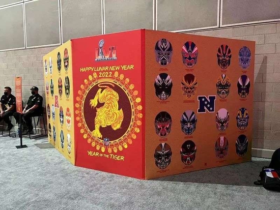 超级碗在正月十四上演,NFL就专门在球迷体验区设置了展板,以虎年图案和32支球队的脸谱图案来庆祝中国的农历新年。每年的超级碗上,球迷体验区都值得一逛。在今年设置的球迷体验区,球迷可以体验球员体测的摸高项目,与超级碗冠军奖杯文斯·隆巴迪杯合照,还可以参观头盔墙、中场表演服装展示等。此外,为了展示低碳决心,场馆内的垃圾桶用的都是环保纸板。