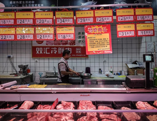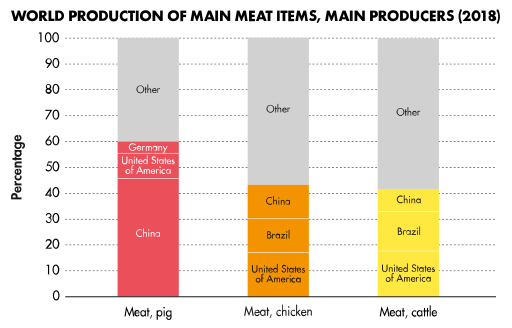2018年,中国猪肉产量占了全球猪肉产量的40%多(最左边红色柱状图) 图/wikipedia