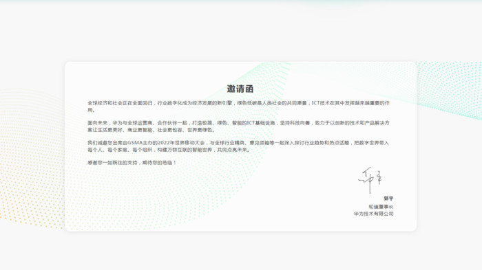 MWC2022确认将于2022年2月28日-3月3日在西班牙巴塞罗那举行,华为除了确认出席外,也确定将于开展的前一天也就是2月27日举办华为Day0论坛。华为轮值董事长郭平亦发出邀请函:“我们诚邀您出席由GSMA主办的2022年世界移动大会,与全球行业精英、意见领袖等一起深入探讨行业趋势和热点话题,把数字世界带入每个人、每个家庭、每个组织,构建万物互联的智能世界,共同点亮未来。”