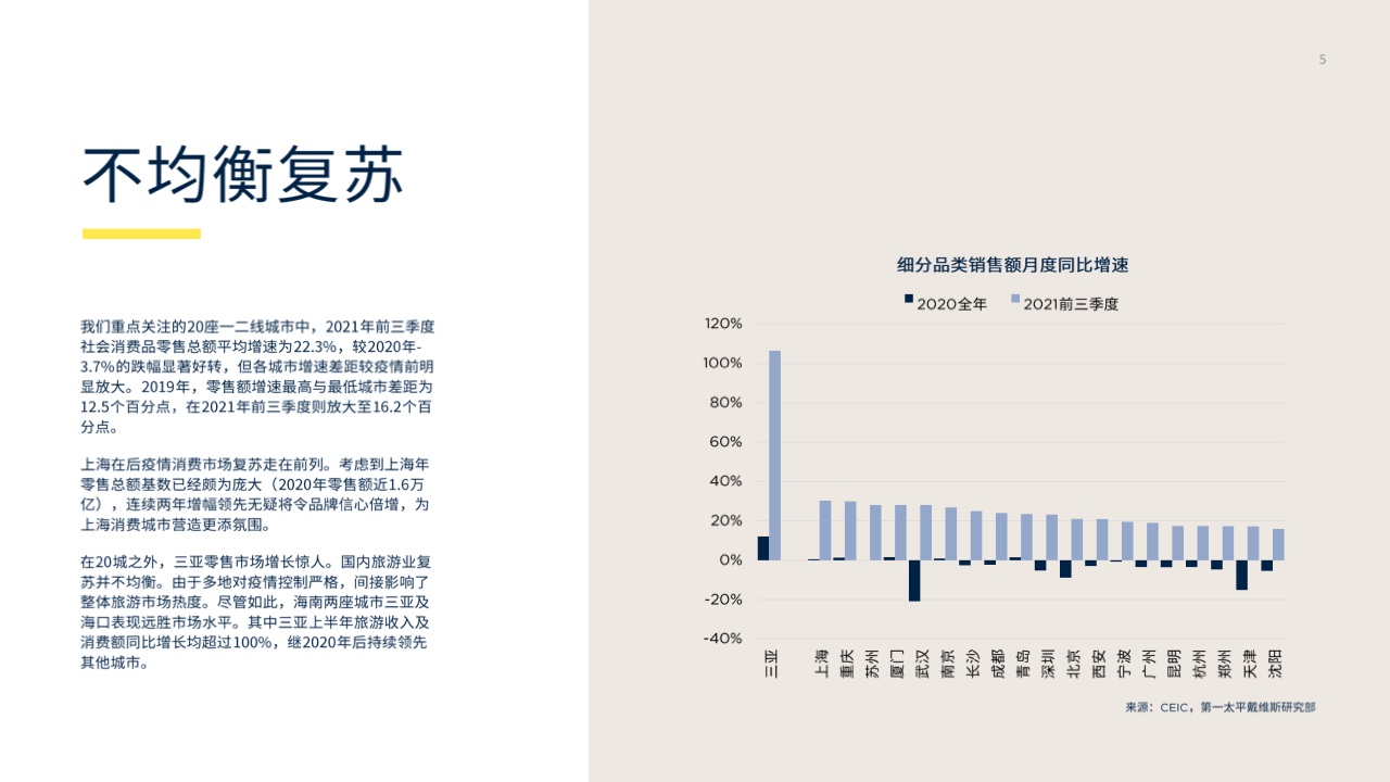 在20城之外,三亚零售市场增长惊人。由于多地对疫情控制严格,国内旅游业复苏并不均衡,间接影响了整体旅游市场热度。尽管如此,三亚表现远胜市场水平,上半年旅游收入及消费额同比增长均超过100%,继2020年后持续领先其他城市。