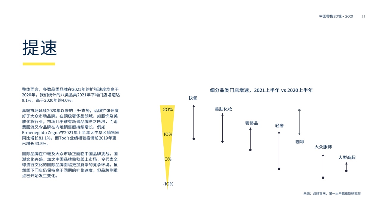 整体而言,多数品类品牌在2021年的扩张速度均高于2020年。我们统计的八类品类2021年平均门店增速达9.1%,高于2020年的4.0%。