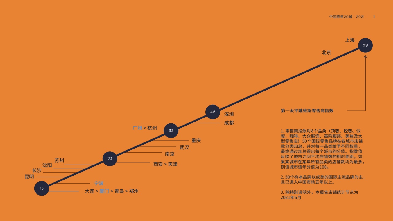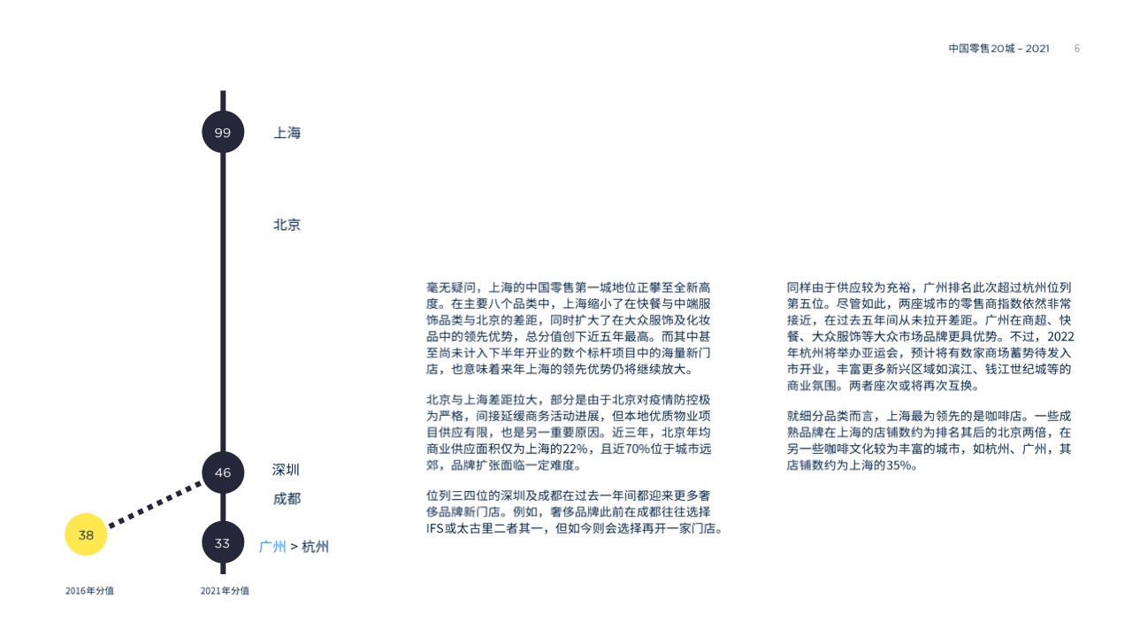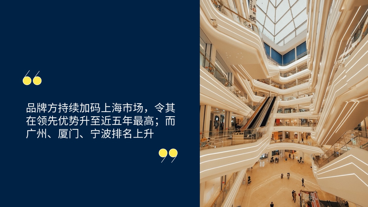 由于市场供应较为充裕,广州排名此次超过杭州位列第五位。尽管如此,两座城市的零售商指数依然非常接近,在过去五年间从未拉开差距。广州在商超、快餐、大众服饰等大众市场品牌更具优势。不过2022年杭州将举办亚运会,预计将有数家商场蓄势待发入市开业,丰富更多新兴区域如滨江、钱江世纪城等的商业氛围。明年两者座次或将再次互换。
