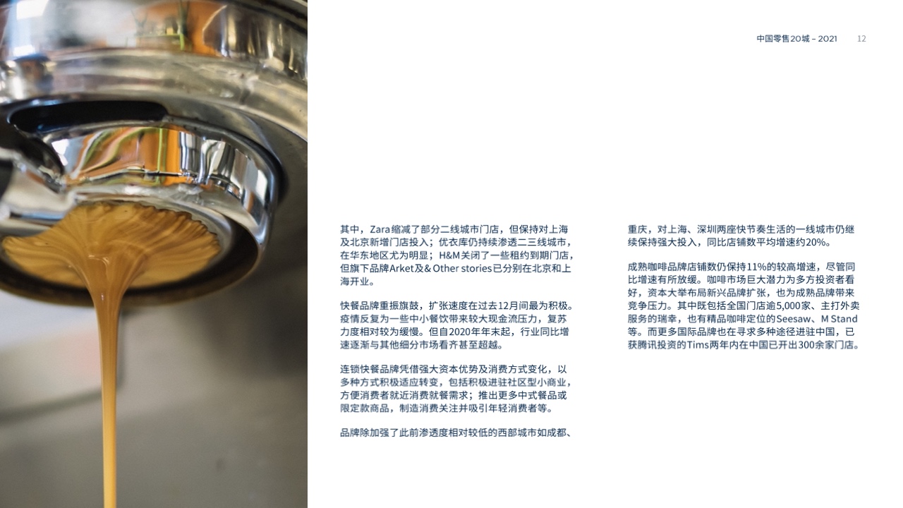 快餐品牌扩张速度在过去12月间最为积极。品牌除加强了此前渗透度相对较低的西部城市如成都、重庆,对上海、深圳两座快节奏生活的一线城市仍继续保持强大投入,同比店铺数平均增速约20%。