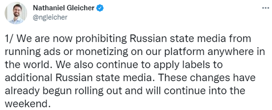 脸书(Facebook)母公司Meta公司安全政策负责人纳撒尼尔·格雷切(Nathaniel Gleicher)2月26日在Twitter上表示:“我们正在禁止俄罗斯国家媒体在公司任何地区的平台上运行广告或实现盈利,并将继续对更多的俄罗斯国家媒体贴上标签,这些变化已经开始推出,并将持续到周末。”