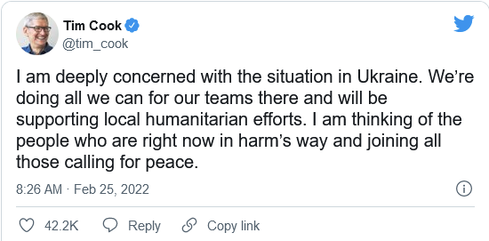 美国在2月对俄罗斯实施制裁,阻止公司向该国出口特定产品,但苹果当时没有停止销售,但在乌克兰提出要求后限制了产品供应。苹果公司首席执行官蒂姆·库克2月24日表示,他“深切关注”乌克兰的局势,并表示苹果公司将“支持当地的人道主义努力”。