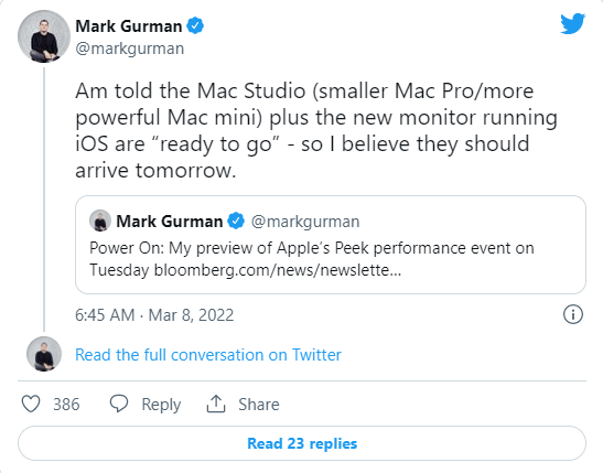 彭博专栏作家马克·格曼(Mark Gurman)在推文中表示,Mac Studio和一款搭载iOS系统的显示器已经“准备就绪”,并将在发布会上亮相。