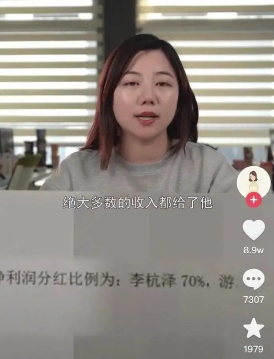 (浪胃仙视频截图)“虽然是签约艺人,我没有按照行业标准去做利益分配,绝大收入都给了对方。”游絮在视频中展示合同内容:浪胃仙账号的直播项目产生的净利润分红比例为,李杭泽70%,游絮30%。