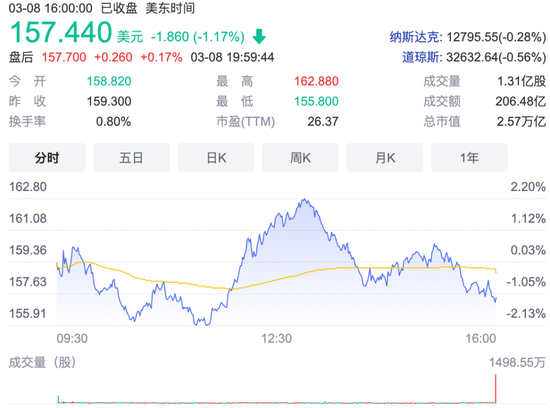 也许是新产品均在外界预计范围内,此次春季新品发布会开始前,苹果股价一度涨2.25%,但发布会后震荡走低,截至收盘下跌1.17%报157.44美元。今年迄今为止,苹果累计下跌了11.22%。