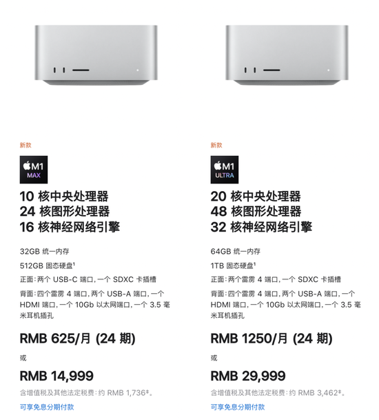 随着M1 Ultra的推出,苹果也带来了一款搭载这块芯片的全新Mac——Mac Studio。这台尺寸不大的电脑可以选配M1 Max或M1 Ultra两块性能芯片,前者起售价14999元,后者起售价29999。