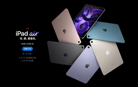 新iPad Air拥有深空灰色、星光色、粉色、紫色、蓝色五种配色,64GB和256GB两种存储。国行价格方面,64GB/Wi-Fi版本4399元、64GB/5G版本5499元、256GB/Wi-Fi版本5499元、256GB/5G版本6599元。