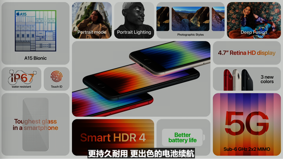 iPhone SE 3 拥有黑、白、红三款配色,搭载 4.7 英寸 LCD 显示屏,配备超瓷晶面板,保留了经典的 Touch ID,续航也更好。此外,iPhone SE 3 搭载 1200 万像素后置镜头,搭配 A15 仿生芯片可以实现更强的拍照功能。