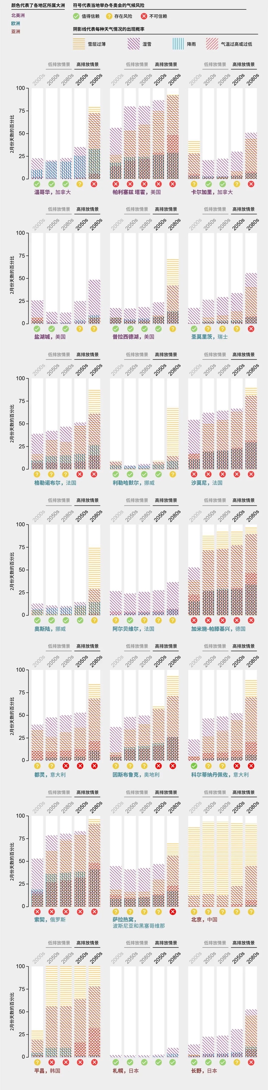 按照这项研究的标准,4 个主办地——法国沙莫尼、俄罗斯索契、美国帕利塞兹和德国加米施-帕滕基兴——如今都已处于“不可信赖”的状态,在这些地区影响最大的因素是气温过高和湿雪。而在高排放情景(温室气体排放几乎不受限制,仍维持着过去 20 年的增长速率的情形)下,到本世纪中叶,只有 4 个主办地(美国普拉西德湖、日本札幌、挪威利勒哈默尔和奥斯陆)仍处于“值得信赖”的状态;到本世纪末,“值得信赖”的更是只剩下了日本札幌。