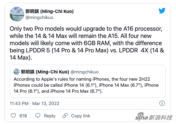 他在推特上提到,2022年的iPhone 14系列仍旧会有四款产品,6.1英寸的“iPhone 14 Pro”和6.7英寸的“iPhone 14 Pro Max”将使用A16芯片,而6.1英寸的“iPhone 14”和6.7英寸的“ iPhone 14 Max”将是A15芯片。