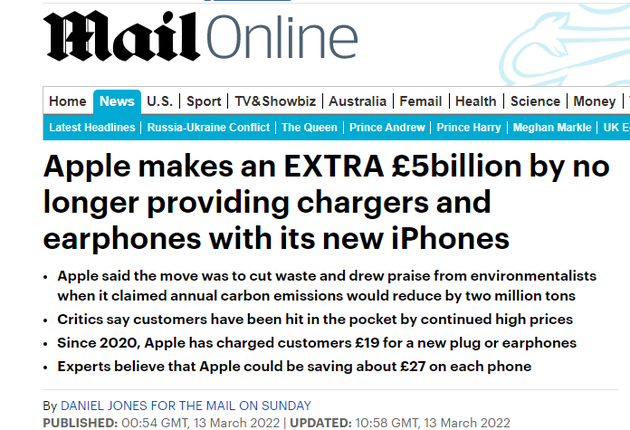 自从宣布这一举措以来,苹果在全球范围内已经售出了超1.9亿部iPhone。得益于取消充电器和耳机,再加上减少的运输成本,总收益可达50亿英镑,另外估计还有2.25亿英镑来自配件销售。