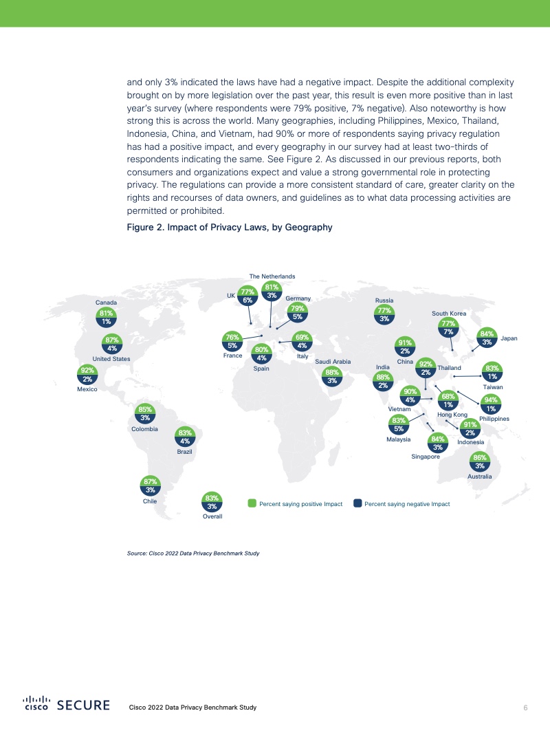 ● 目前已有140多个司法管辖区通过了综合隐私法,近80%的受访者认为这些法律具有积极影响。