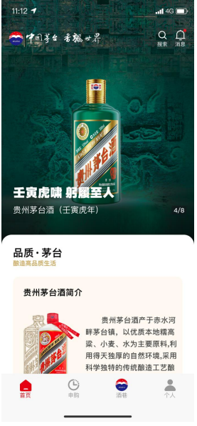 从平台首页看,该界面设计非常简洁,符合茅台产品视觉风格。界面头图页展示的是虎年生肖酒,以及单独的茅台酒简介板块。