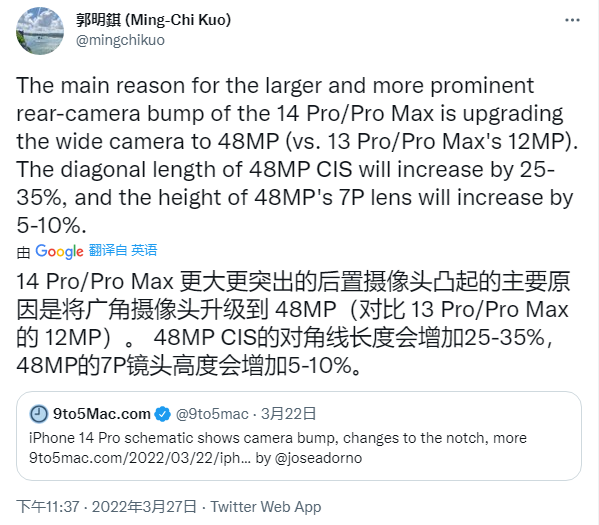 郭明錤认为,苹果用 48MP 传感器取代了原本的 12MP 主传感器是这一代机型摄像头凸起较厚的主因。他表示,与 iPhone 13 Pro 的主摄单元相比,新一代 48MP 模块的对角线长度将增加约 25% 至 35%,而其 7P 镜头的高度(厚度)将增加 5% 至 10% .