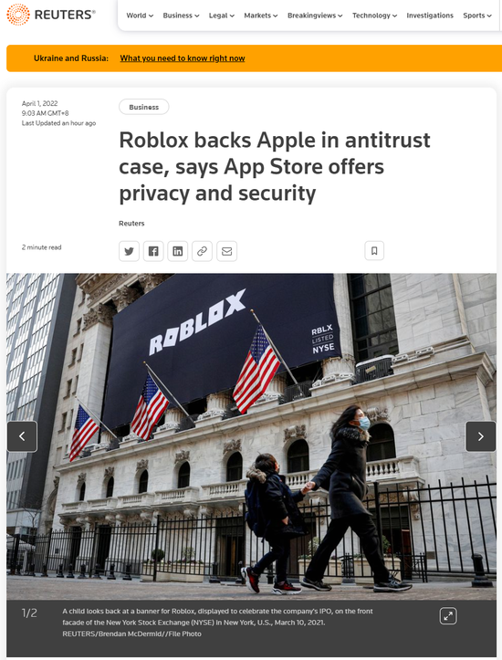 4月1日消息,据路透社报道,在线游戏平台Roblox Corp周四表示,苹果公司的App Store为其用户提供了隐私和安全方面的好处,其支持苹果在美国一起关键的反垄断案中赢下对Epic Games的上诉。