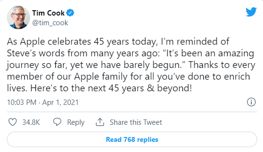去年 4 月 1 日,CEO 蒂姆・库克在纪念苹果公司成立 45 周年时发了一条推特,回顾了他的朋友和同事、联合创始人史蒂夫・乔布斯。