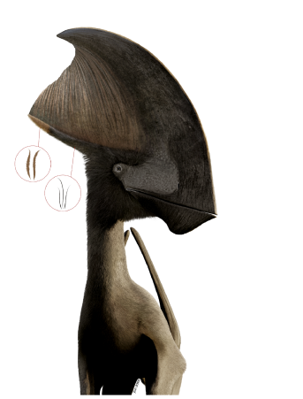 在该翼龙的头冠上,研究人员发现了单链纤维和类似羽毛的分支纤维,它们的中心轴在基部变窄。在扫描电子显微镜下,其皮肤和羽毛都有黑素体,这是一种含有黑色素的细胞内的结构,为活体动物的皮肤、羽毛和皮毛提供色素,不同形状的黑素体会赋予不同的颜色。翼龙的黑素体有各种各样的形状——卵形、球形和细长形,这些形状迄今为止只在哺乳动物的皮毛以及恐龙和鸟类的羽毛中见过。