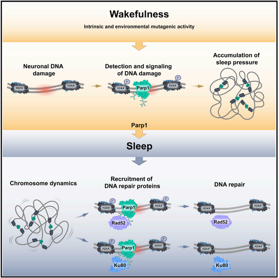 清醒和睡眠的循环:白天神经元的DNA损伤增加,留下标记,导致睡眠压力增加。晚上,染色体活动增加,Parp蛋白募集修复蛋白,促进DNA修复。图片来源:原论文