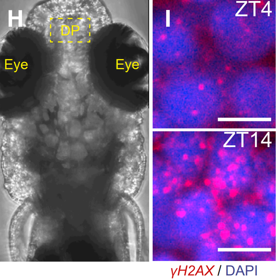 研究人员发现与刚睡醒时(ZT4)相比,斑马鱼活动一天后(ZT14)的γH2AX位点数明显增多,也就是说DNA双链断裂数量增多。图片来自原论文。