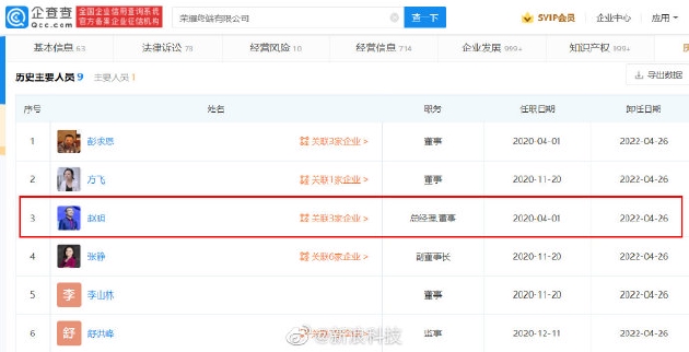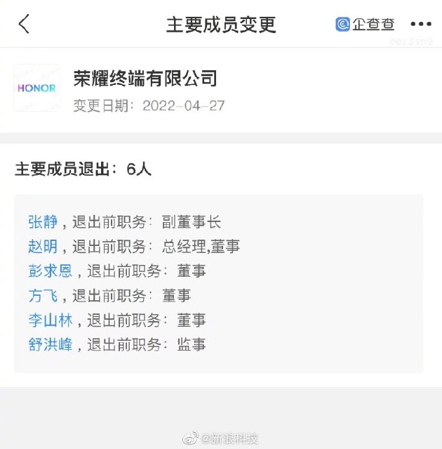 新浪科技讯 4月27日午间消息,企查查APP显示,4月26日,荣耀终端有限公司发生工商变更,荣耀CEO赵明卸任总经理,董事职务。此外,张静、彭求恩等多名董事高管也退出了该公司,当前公司主要人员仅剩董事长万飚。