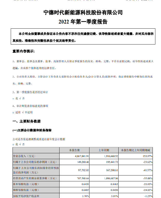 新浪科技 4月29日下午消息,宁德时代公布第一季度业绩。一季度,宁德时代营收486.8亿元,同比增长153.97%;净利润14.93亿元,同比下降23.62%,扣非净利润同比下降41.57%。