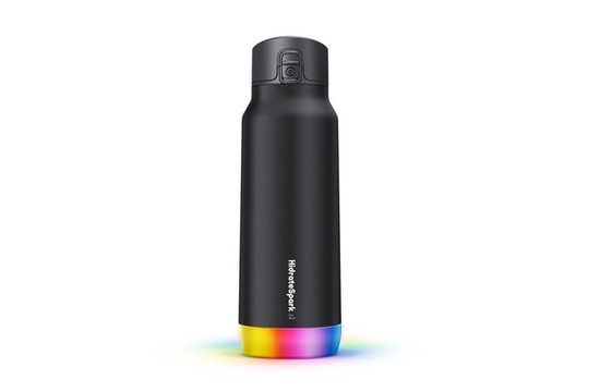其中,HidrateSpark PRO STEEL有着不锈钢瓶身,是一个真空隔热的约900水瓶,可以保持水温达24小时。该水壶有圆壶口和吸管两种盖子,底部有一个LED小球,以可定制的颜色和图案亮起,提醒你一天中喝水。LED小球还能感知用户饮水量,并通过蓝牙数据传输到iPhone手机并同步到苹果健康。