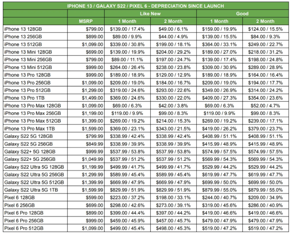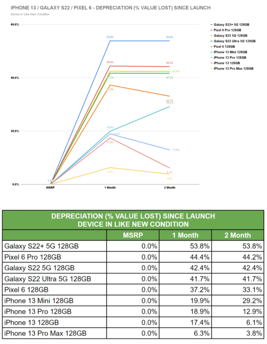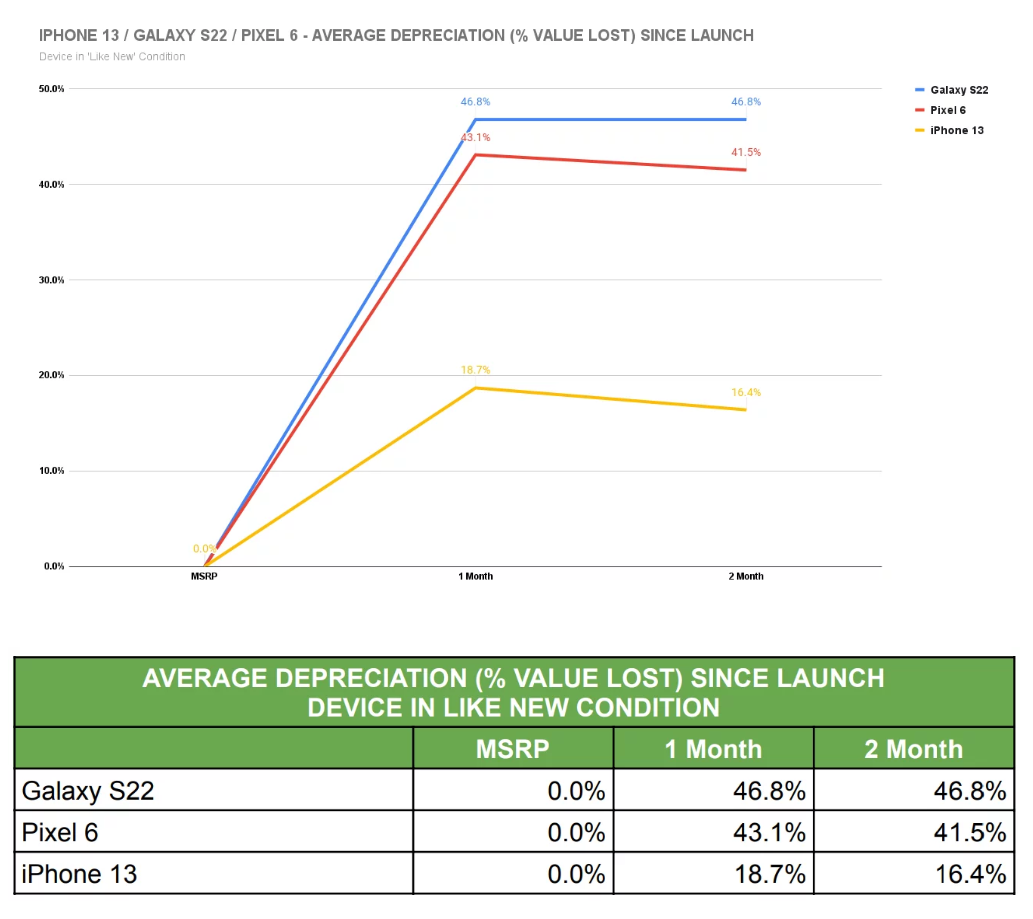报告称,发售两个月后,三星 Galaxy S22 系列贬值率为 46.8%,而谷歌 Pixel 6 系列贬值 41.5%,iPhone 13 系列仅贬值 16.4%。