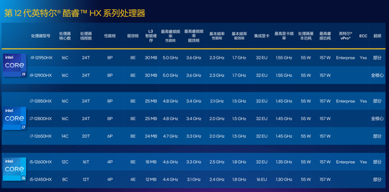 12代酷睿HX系列处理器包括i5到i9共7个型号,核心数量从8核心到16核心,高端i7/i9 型号达到桌面同级别的16核24线程,频率可达5GHz,基础功耗 55W,最高睿频功耗可达157W,核显规格最高为32EU,具体参数如下: