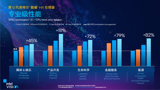 除此之外,i9-12900HX在媒体娱乐、产品开发、生命科学、金融服、能源等多种使用场景中,都比上代拥有较大幅度的提升。