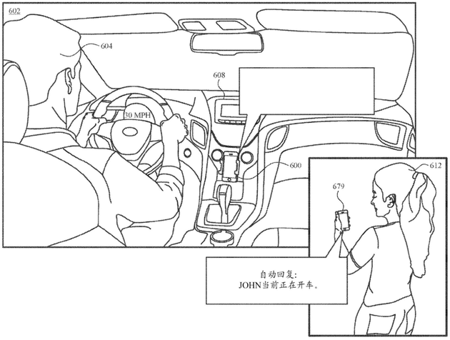 从专利图可以看到,当用户在开车时,iPhone 手机将自动回复“JOHN(用户名称)当前正在开车”,似乎会检测用户的车速,从而自动开启该功能。