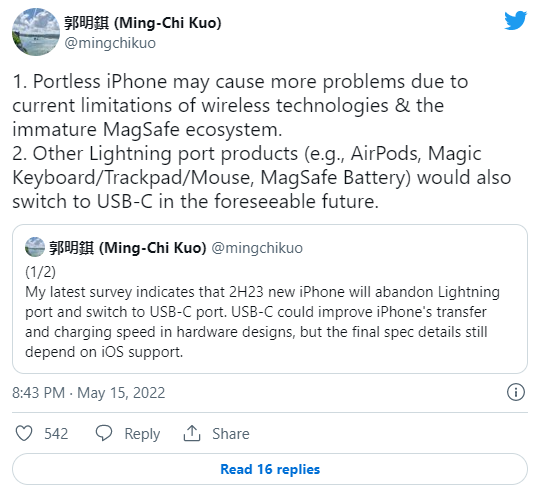 新浪科技讯 北京时间5月16日早间消息,据报道,上周早些时候,著名苹果分析师郭明錤宣称苹果计划至少在2023年发布的一款iPhone 15机型中增加USB-C接口。现在,他又在后续的推文中声称,AirPods、MagSafe充电器以及妙控键盘/鼠标/触控板也将在“可预见的未来”采用USB-C接口。