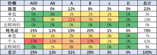 电动车在出租网约市场占据绝对优势,前期出租网约使用电动车是政策驱动,近期是产品提升后的成本驱动,出租司机舍不得开油车跑出租。