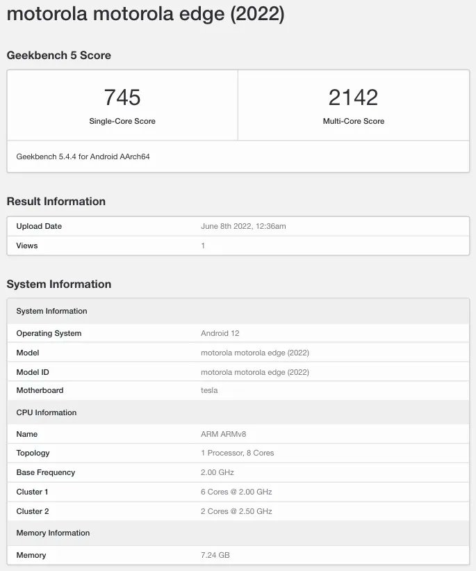 摩托罗拉 Edge 2022 本周出现在了基准测试平台 Geekbench 上。