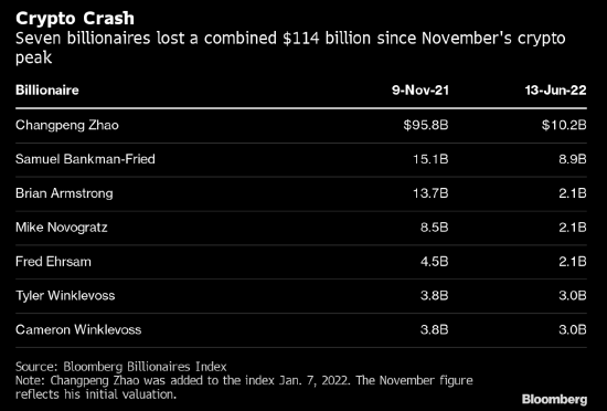 此外,根据彭博亿万富翁指数,自去年11月9日比特币达到近69000美元的历史新高到现在比特币及加密市场跌至近2年内最低,七位与加密货币相关的亿万富翁总共损失了1140亿美元。