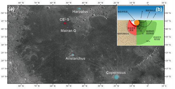 (a) 嫦娥五号着陆点、Mairan G、Aristarchus、Harpalus和Copernicus撞击坑位置;(b) 撞击坑形成示意图。图片来源:中国科学院地球化学研究所