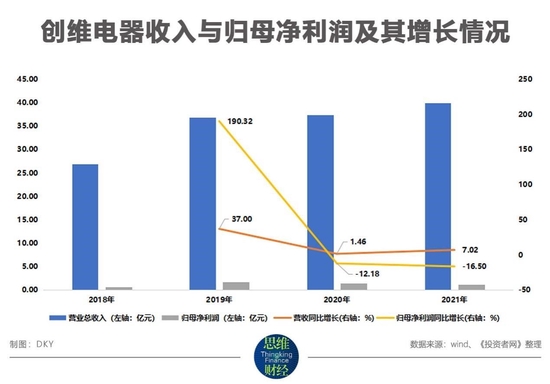 据创维电器披露,2019-2021年,公司实现营收分别为36.85亿元、37.39亿元、40.02亿元,整体上呈现增长的趋势;期间归母净利润分别为1.69亿元、1.48亿元、1.24亿元,与公司收入增长的趋势相反,在2019-2021年期间内,创维电器增收不增利。