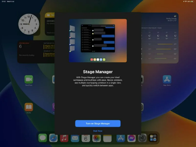 在iPad上,有一个新的功能叫做台前调度,这个功能具有一个新的界面,来实现多任务处理。第一次使用时,还会有一些新手教程,教你如何使用它。